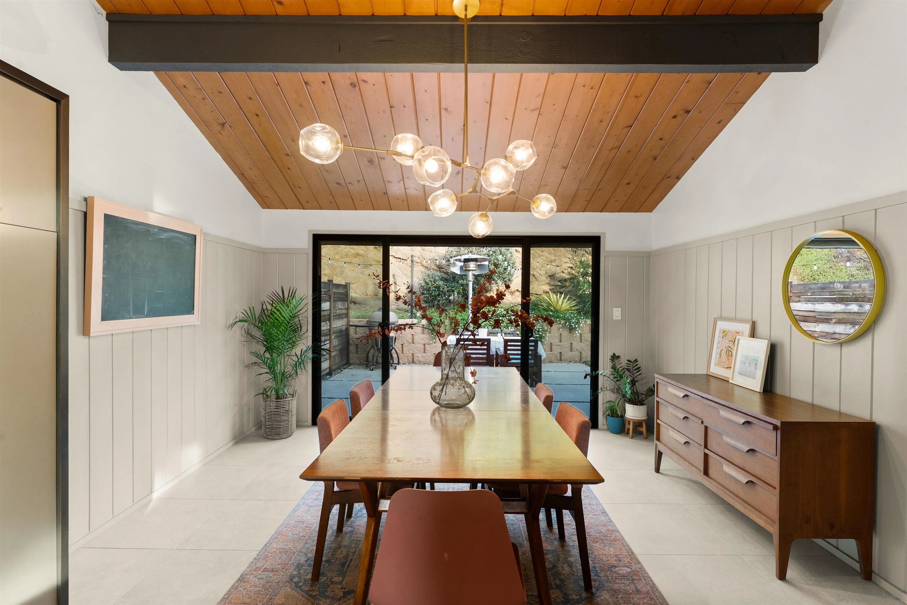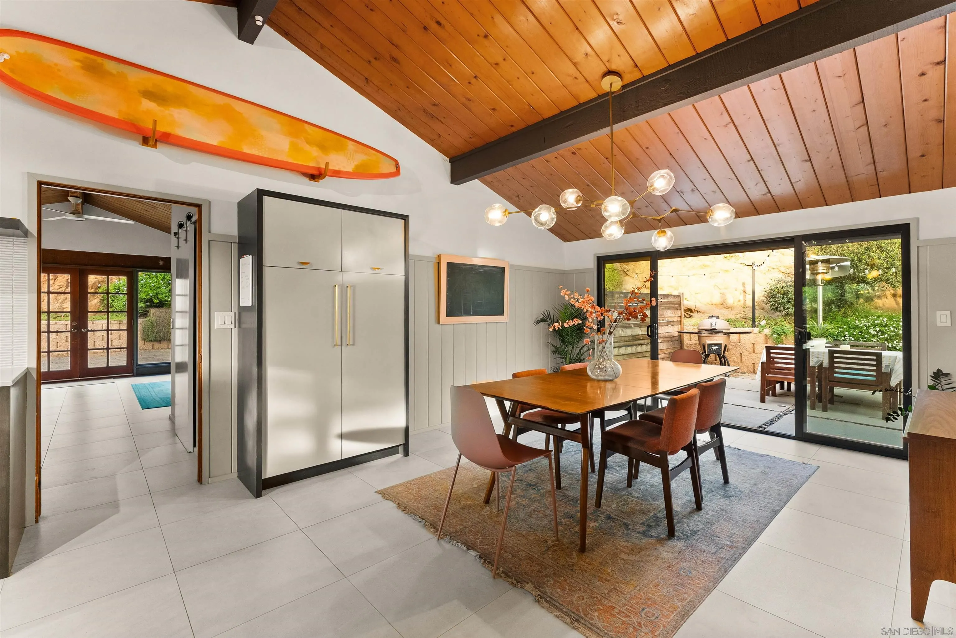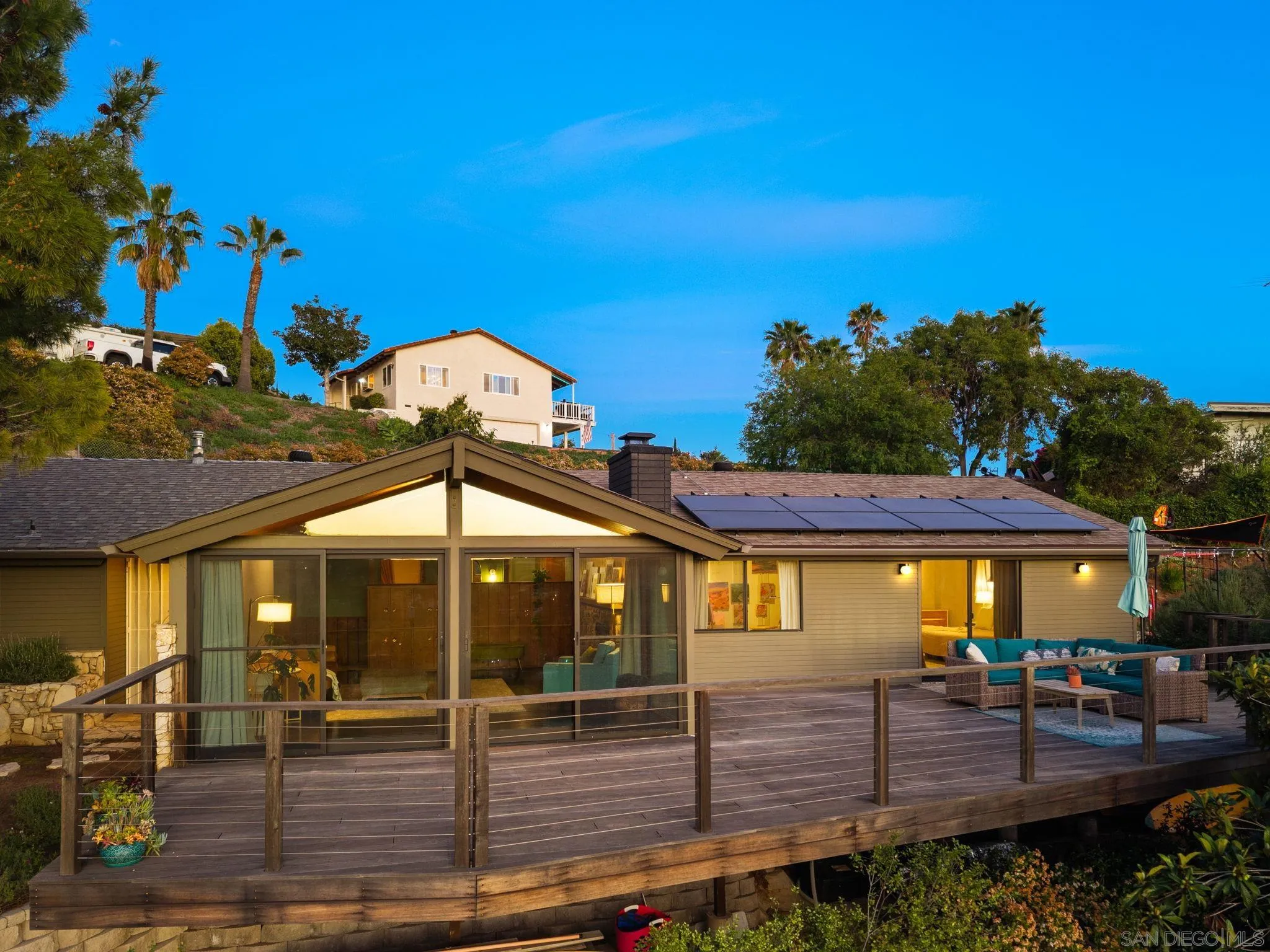 A timeless mid-century modern hillside retreat with panoramic sunset and valley views! Extensively remodeled, this distinctive home blends timeless design with sophisticated modern upgrades and seamless indoor-outdoor living. Dramatic vaulted wood plank ceilings and expansive glass fill the home with natural light, while the living room's stone fireplace opens to a spacious wraparound deck--perfect for entertaining or enjoying San Diego's spectacular sunsets. This home radiates soul and character. Complete with a large bonus/flex space perfect for offices, guests or a creative studio! The designer kitchen features custom cabinetry, matte quartz countertops, brass hardware, statement backsplash, and premium KitchenAid appliances including a concealed panel dishwasher. The primary suite offers vaulted ceilings, engineered wood flooring, and direct deck access, creating a peaceful private retreat. Exterior features Hardie siding, Milgard windows and doors, leased solar, drought-tolerant landscaping, fruit trees, and multiple areas for relaxing or entertaining. Privately nestled in nature yet just minutes from all that San Diego has to offer, the home delivers both seclusion and convenience