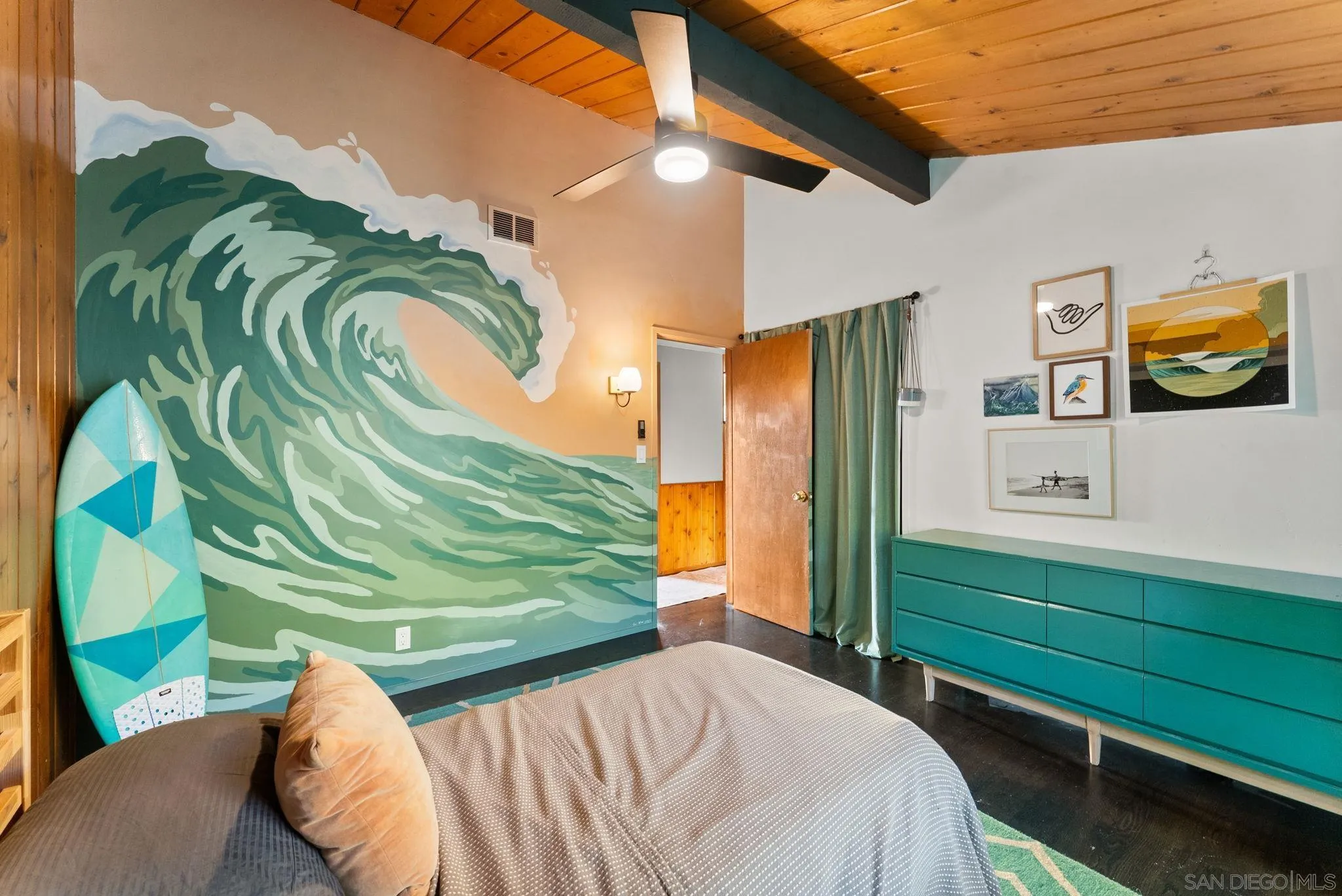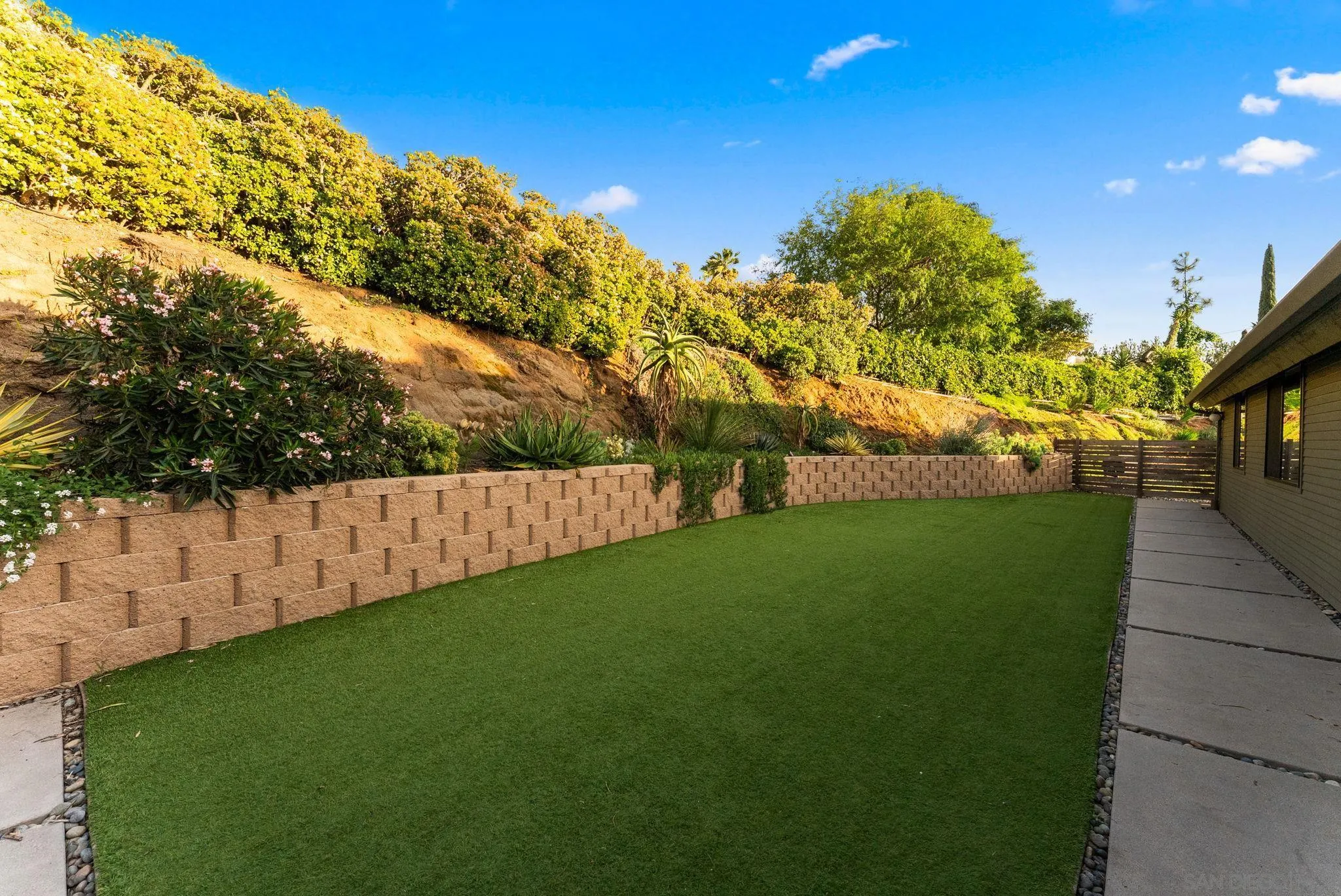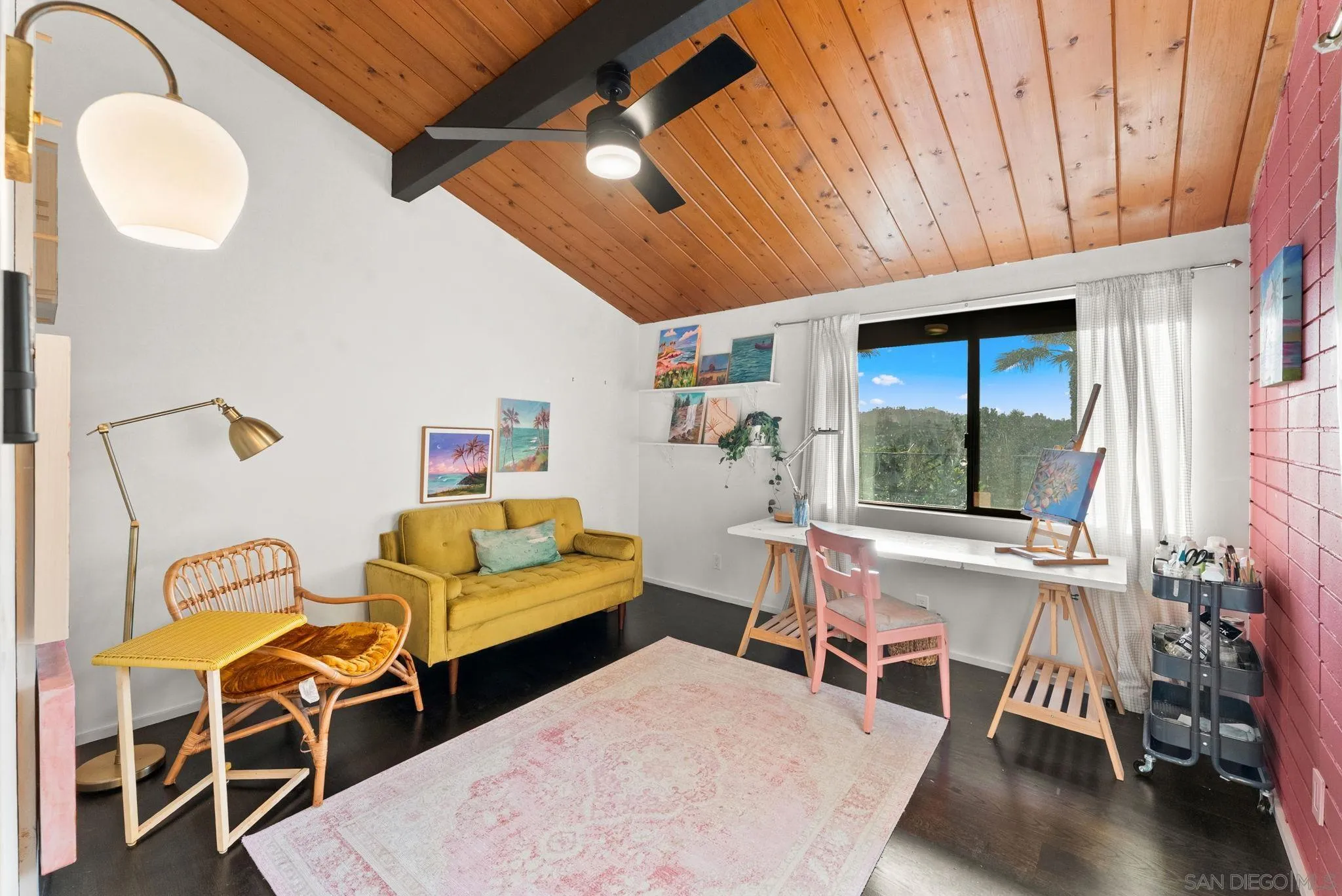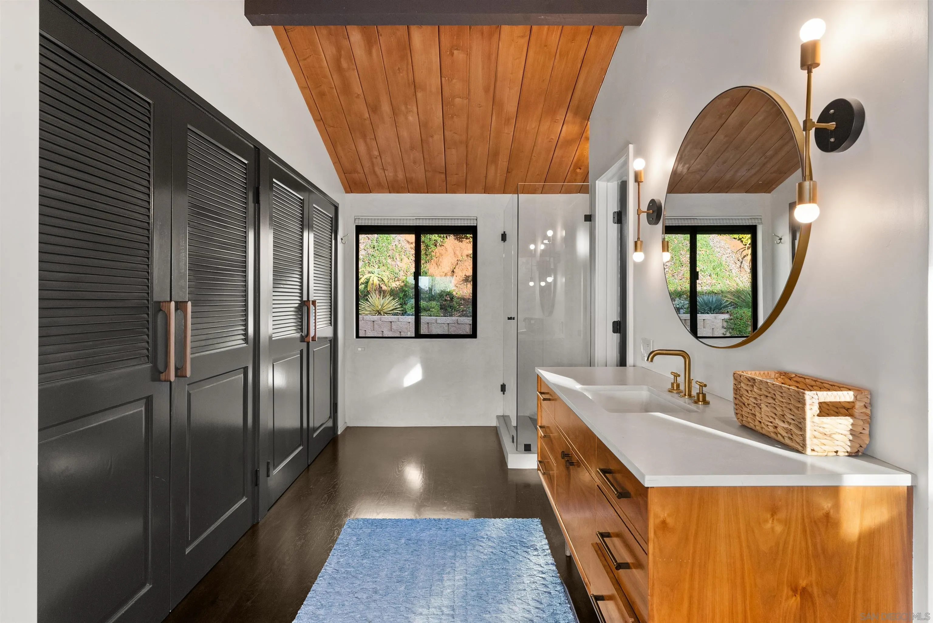 A timeless mid-century modern hillside retreat with panoramic sunset and valley views! Extensively remodeled, this distinctive home blends timeless design with sophisticated modern upgrades and seamless indoor-outdoor living. Dramatic vaulted wood plank ceilings and expansive glass fill the home with natural light, while the living room's stone fireplace opens to a spacious wraparound deck--perfect for entertaining or enjoying San Diego's spectacular sunsets. This home radiates soul and character. Complete with a large bonus/flex space perfect for offices, guests or a creative studio! The designer kitchen features custom cabinetry, matte quartz countertops, brass hardware, statement backsplash, and premium KitchenAid appliances including a concealed panel dishwasher. The primary suite offers vaulted ceilings, engineered wood flooring, and direct deck access, creating a peaceful private retreat. Exterior features Hardie siding, Milgard windows and doors, leased solar, drought-tolerant landscaping, fruit trees, and multiple areas for relaxing or entertaining. Privately nestled in nature yet just minutes from all that San Diego has to offer, the home delivers both seclusion and convenience