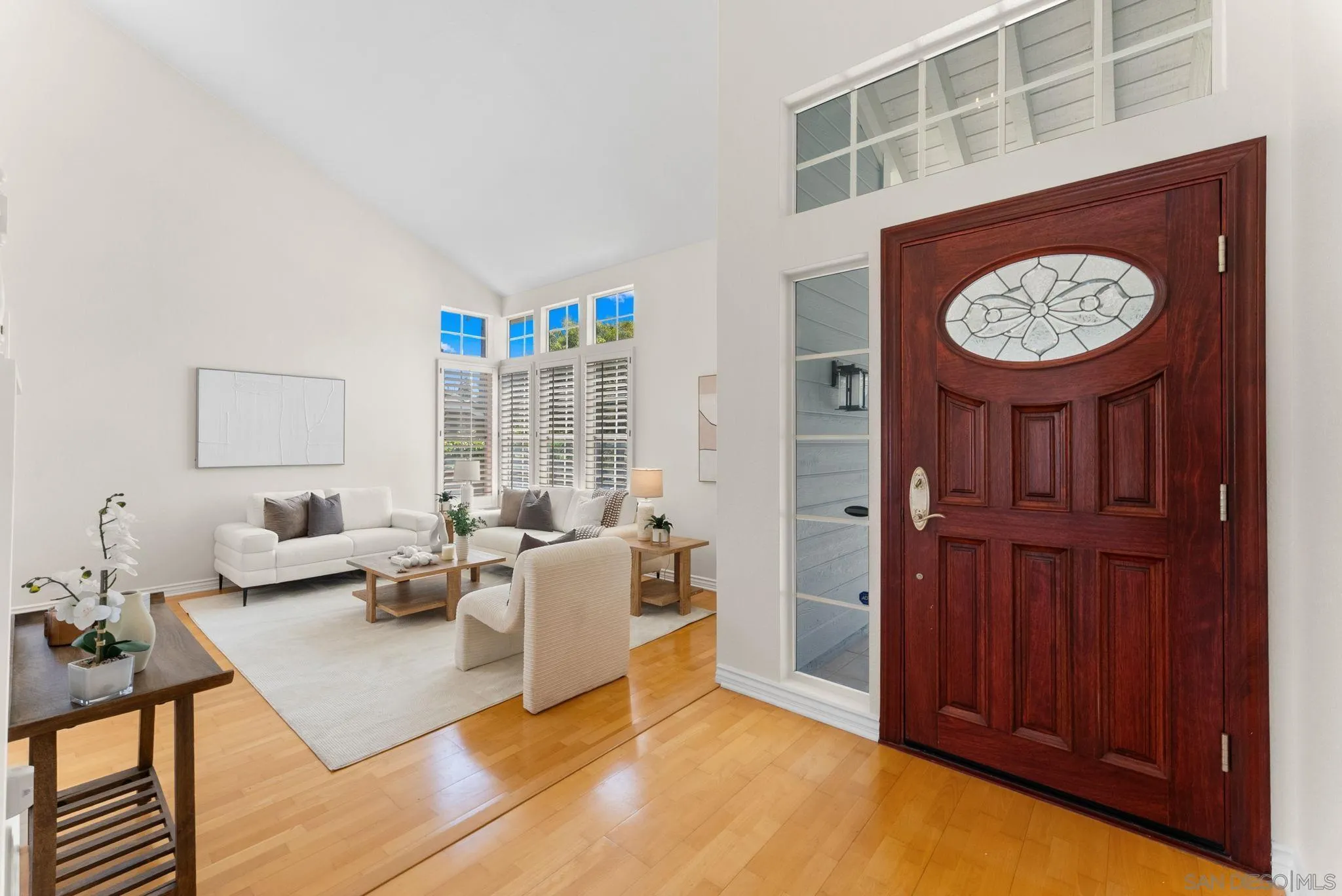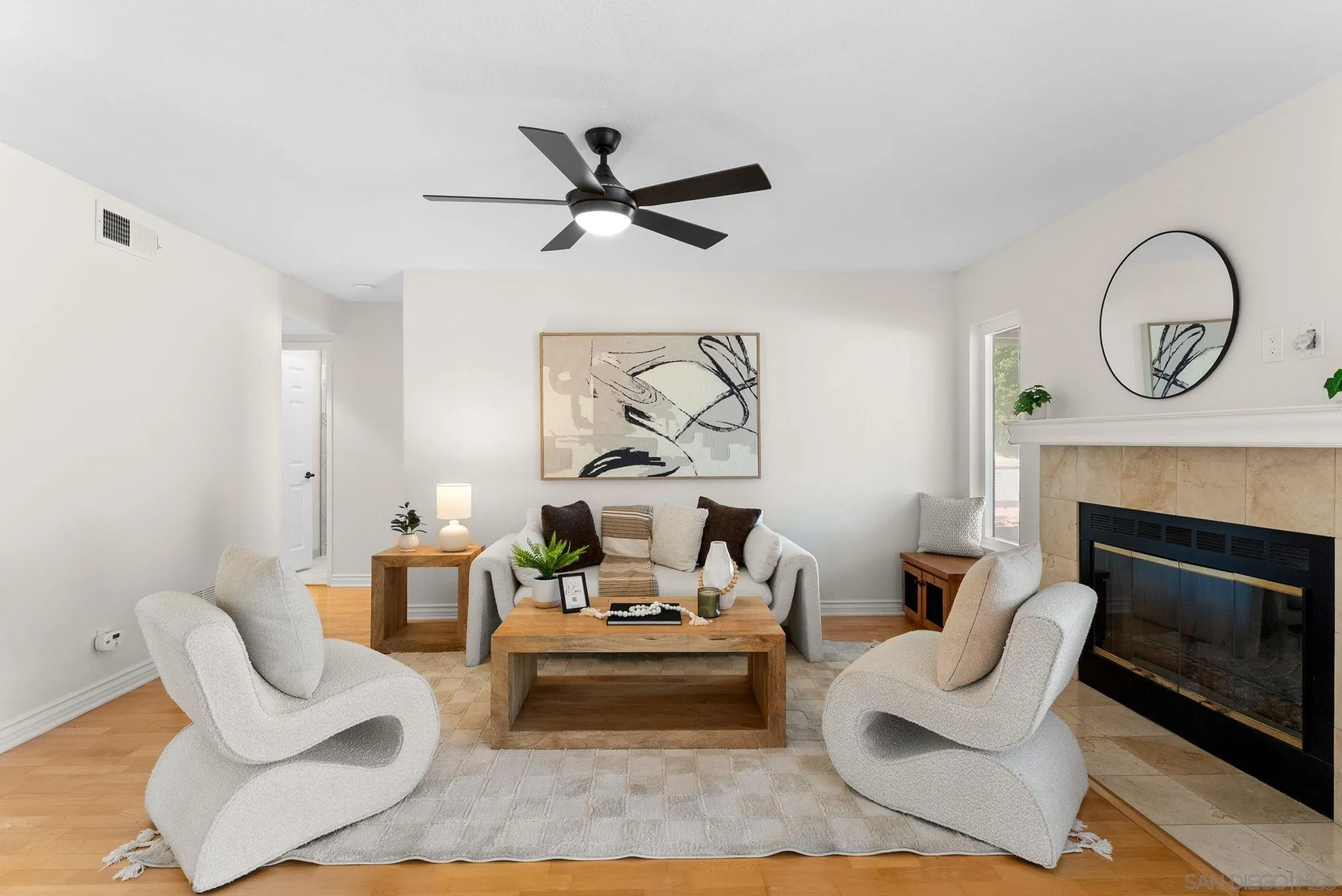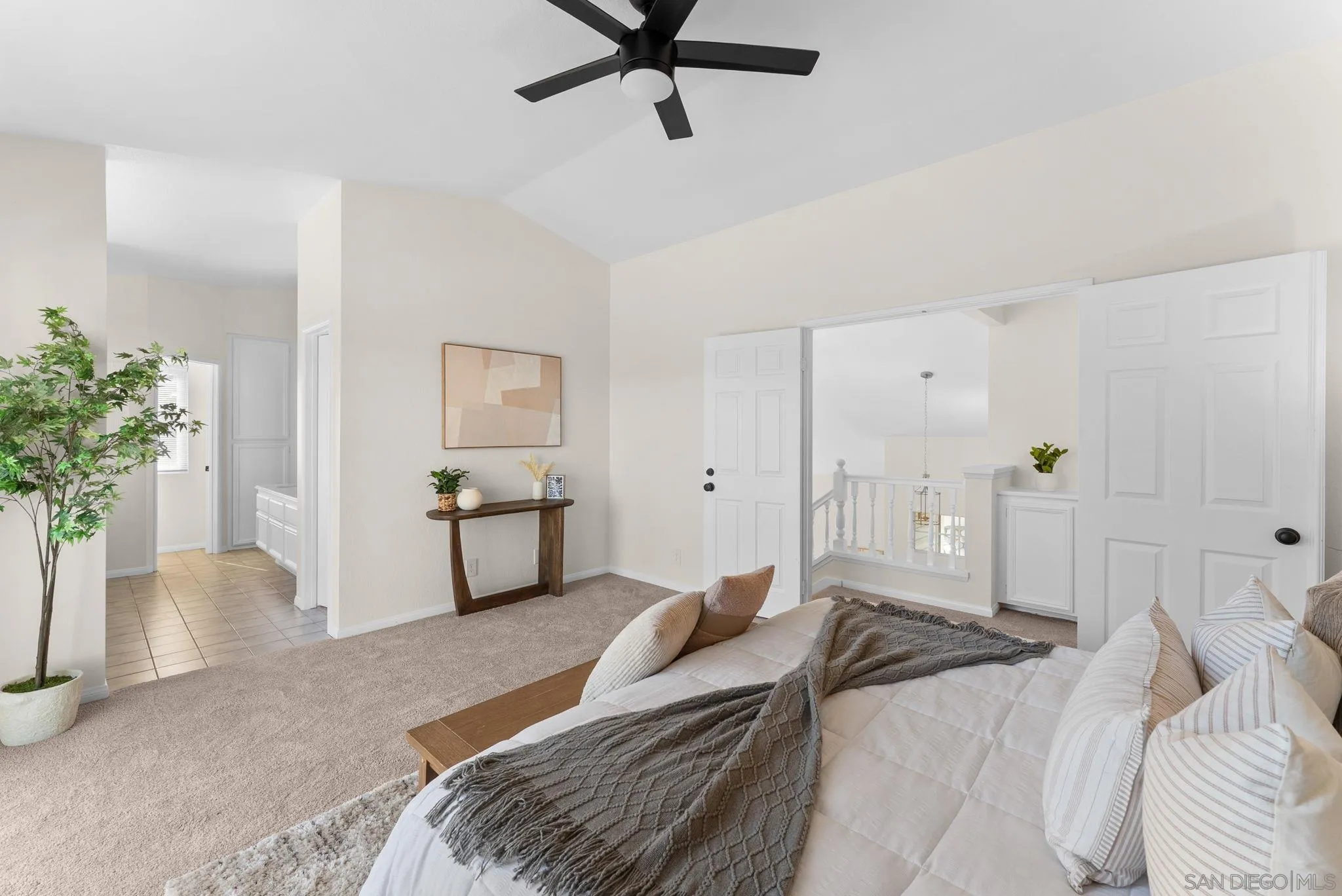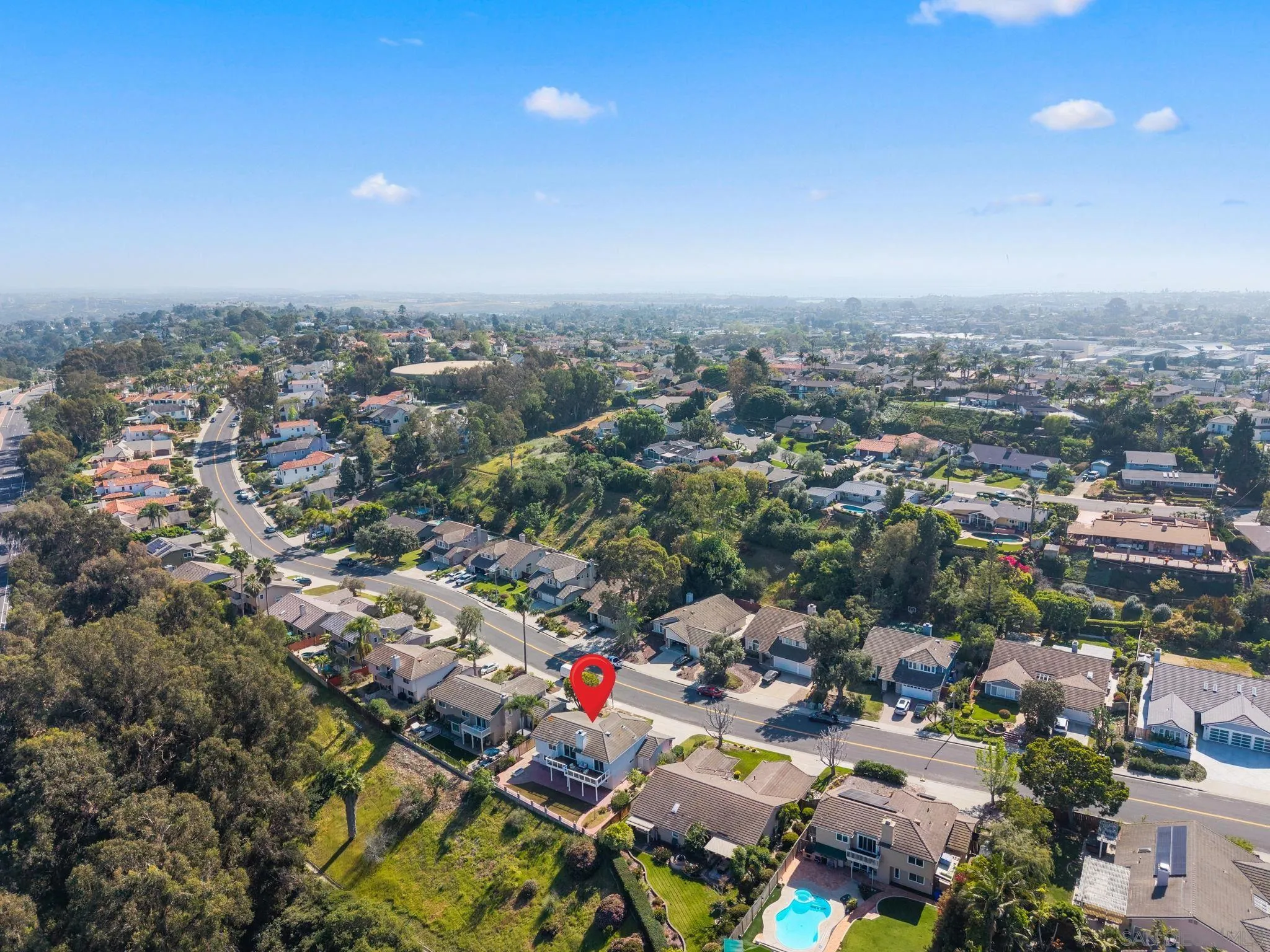 Welcome to this spacious and beautifully refreshed 5 bedroom, 3 bathroom home in one of Carlsbad's most desirable neighborhoods - Brentwood Heights. This two-story residence with vaulted ceilings offers flexible living spaces, timeless updates, hardwood floors, new carpet, and scenic views. Inside you'll find a freshly painted interior and light-filled floor plan. The main level features a guest bedroom and renovated full bathroom. Multiple living areas include a formal living room, dining area, and a cozy family room with a fireplace. The kitchen features custom-finished cabinets and ample storage including a generous pantry. Full size convenient laundry room on the main floor. Upstairs the spacious primary suite has French doors that open to a large, retractable awning-sheltered balcony with stunning views of the San Jacinto snow capped mountains. Primary bathroom is refreshed, with newly finished cabinets, vanity and lighting and a spacious walk in closet. Guest bathrooms both renovated in recent years. Ceiling fans in nearly every room. You will love the backyard with fresh landscaping and elegant paving stones - including a custom built-in gas-fueled fire pit and custom built-in gas grill. Large covered patio and scenic, open views - no neighbors behind you! 3 car garage. Low HOA and NO Mello Roos. Just minutes to shops, restaurants, Carlsbad High, downtown Carlsbad and beaches.
